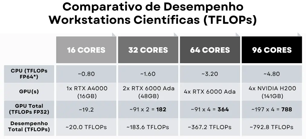 Configurações otimizadas para workloads pesados, incluindo IA generativa, simulações científicas e modelagens computacionais.